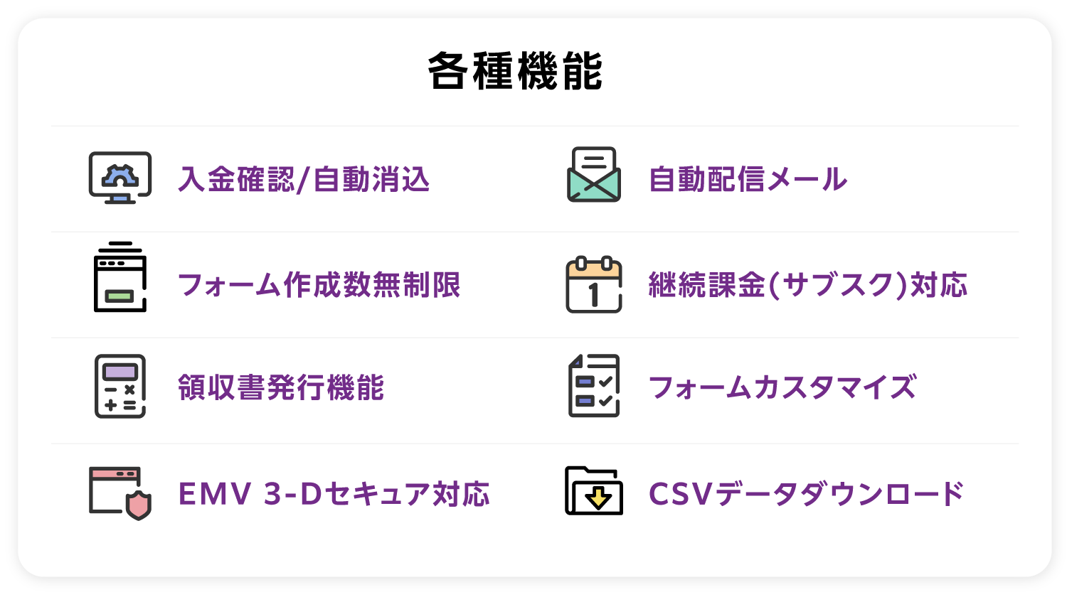 クレジットカードをはじめとした多様なオンライン決済をご導入いただけます。
